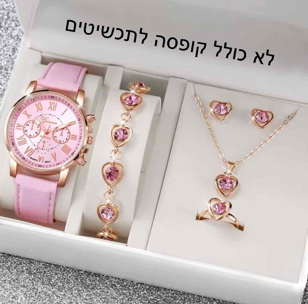 סט אביזרים ותכשיטים תואם לנשים בגווני ורוד רך וזהב-אדום (Rose Gold), המוצג בתוך מארז לבן חגיגי. הסט מעוצב בסגנון רומנטי ויוקרתי, כאשר מוטיב הלב חוזר בכל הפריטים.